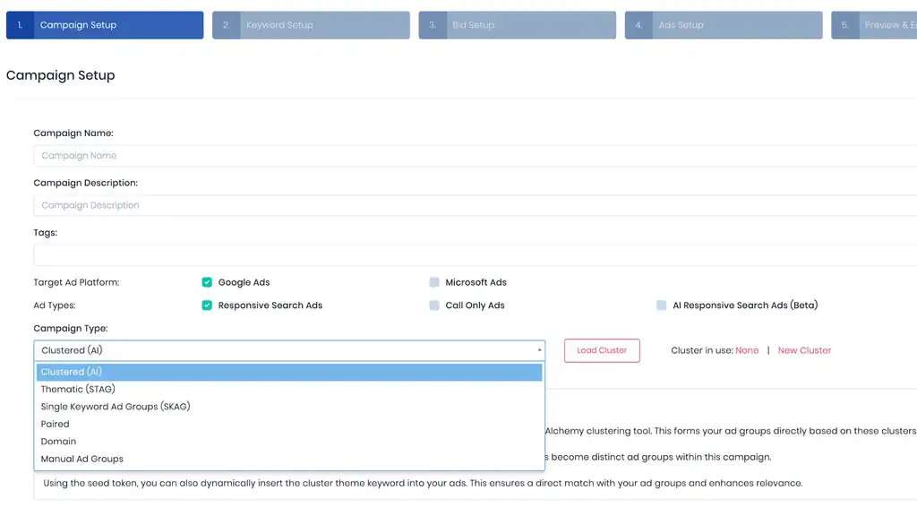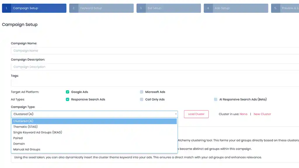 - Choose from campaign structures like single keyword ad groups, thematic ad groups, and paired keywords