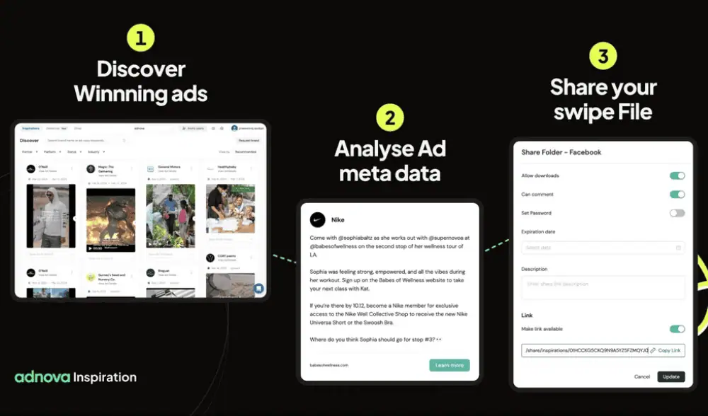 Adnova helps you find ad inspiration and track your competitors’ strategies to create winning creatives in record time.