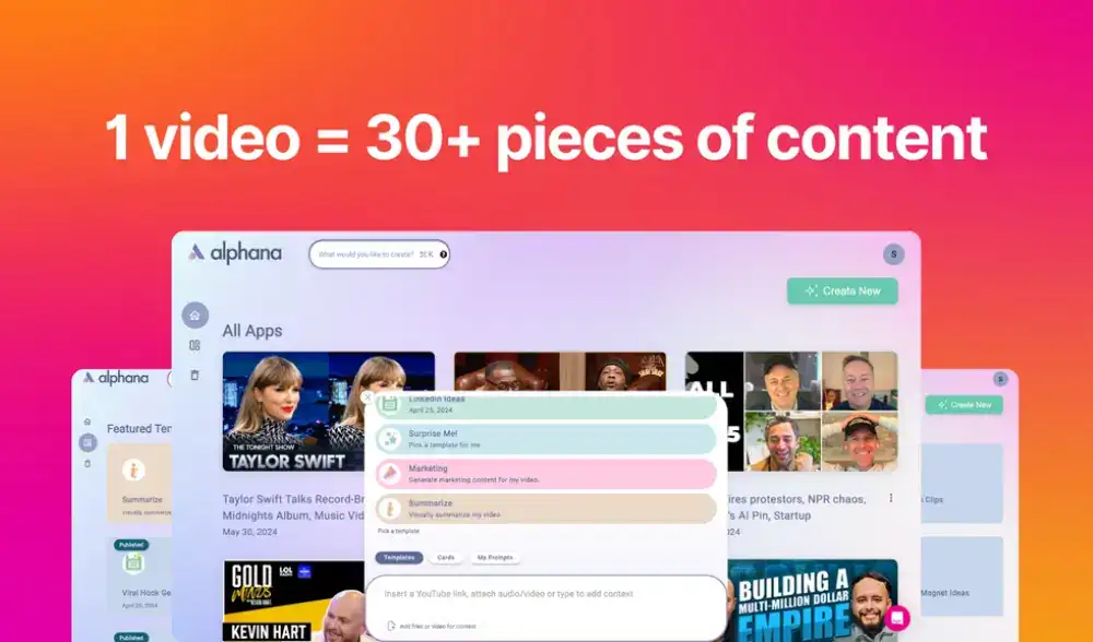 Alphana is an AI content manager that turns your videos into over 30 pieces of ready-to-post content in record time.