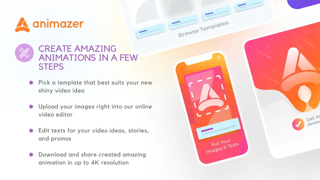 Bring your ideas to life with ease using our online animation tool. Simply choose a template, upload your images, and edit the text to create stunning animations in just a few steps. With up to 4K resolution, your final product will be ready to share in no time.