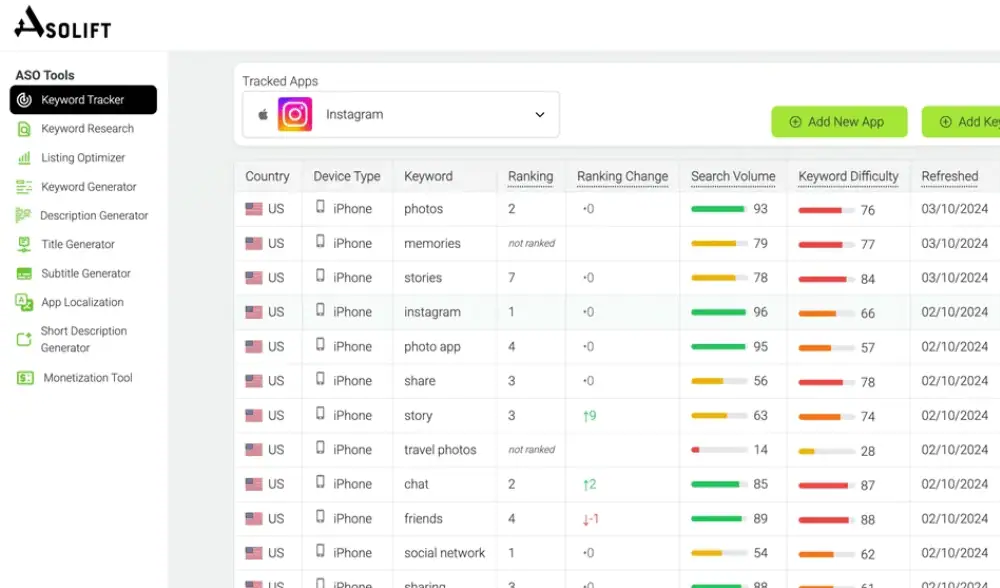 AsoLift’s Keyword Tracker gives you a clear look at rankings, search volume, keyword difficulty, and ranking changes so you can prioritize high-impact opportunities.