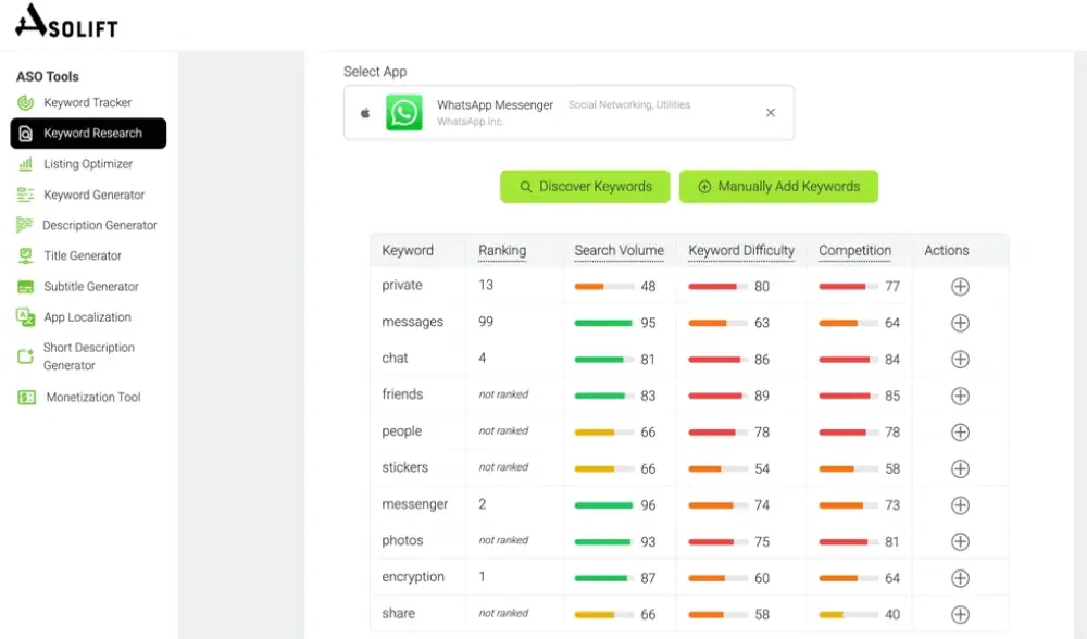 The Keyword Research tool helps you discover keywords based on competition, difficulty, and volume—giving you everything you need to outrank competitors and drive installs.