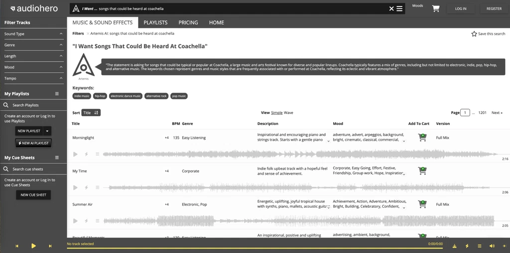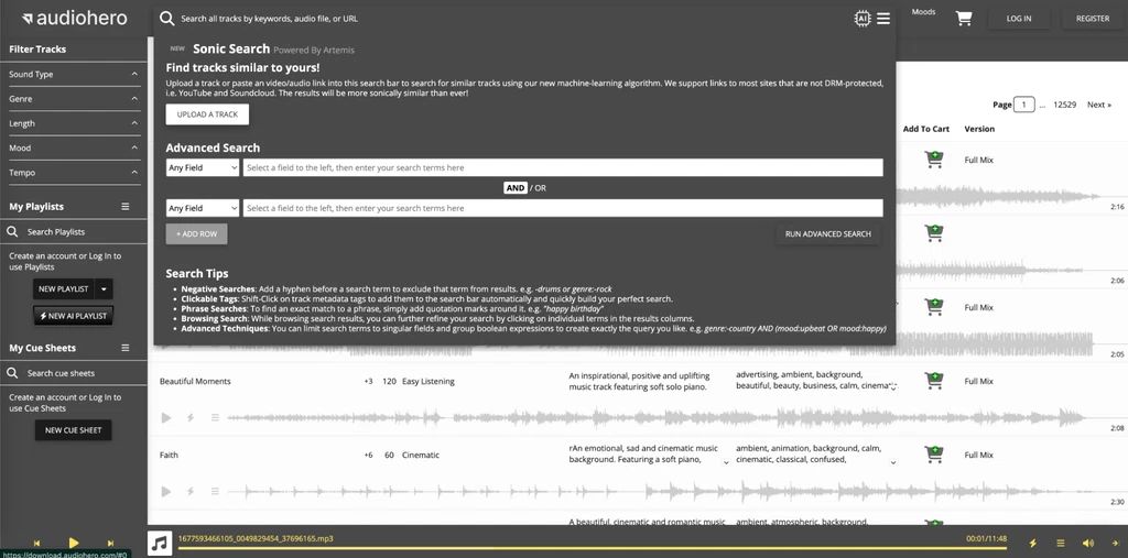 - Filter tracks by genre, length, mood, or tempo to find the right sound