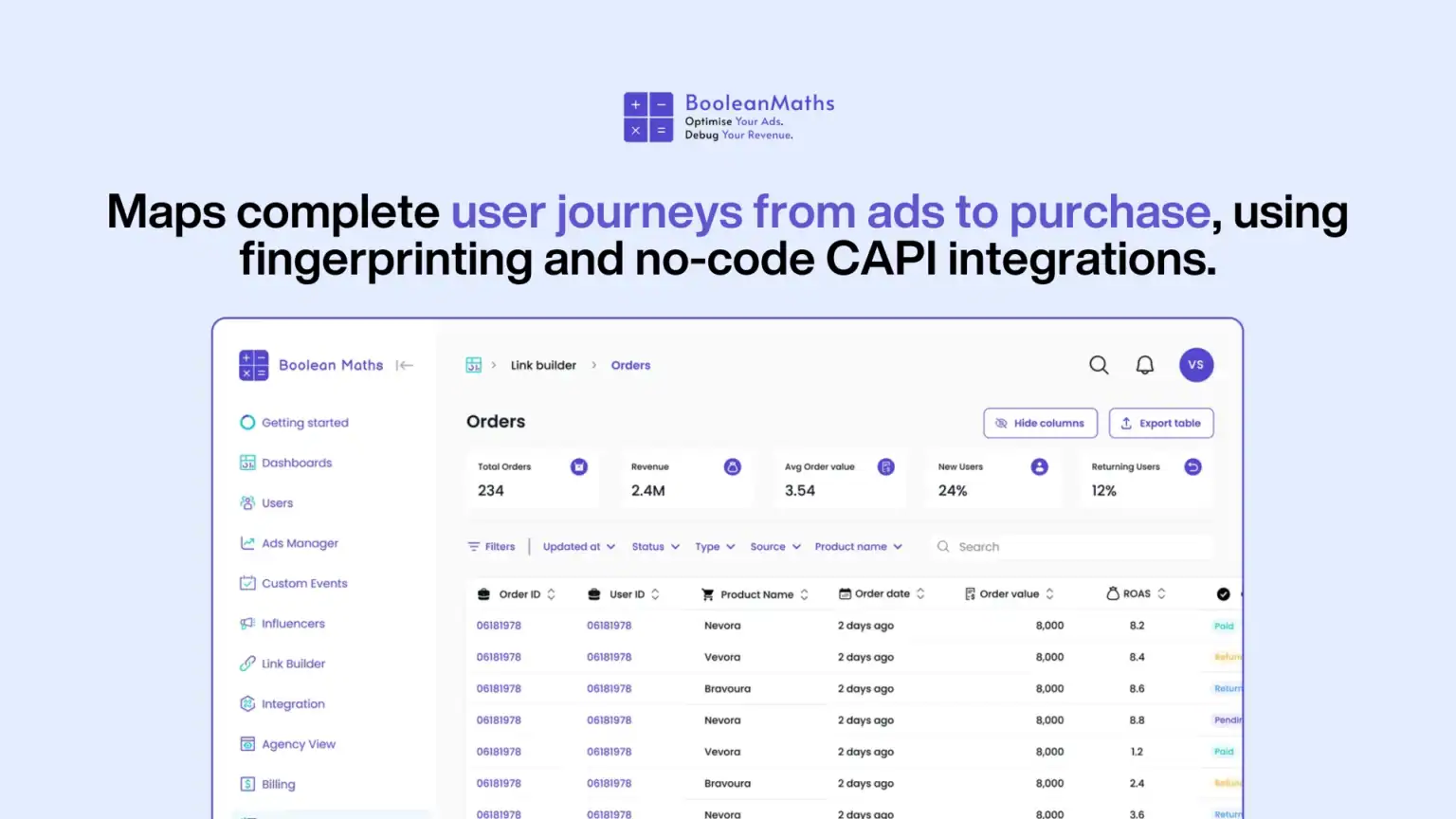 BooleanMaths is a powerful analytics platform that provides precise cross-channel attribution and actionable insights to help you confidently scale campaigns and maximize profit from your entire marketing mix.