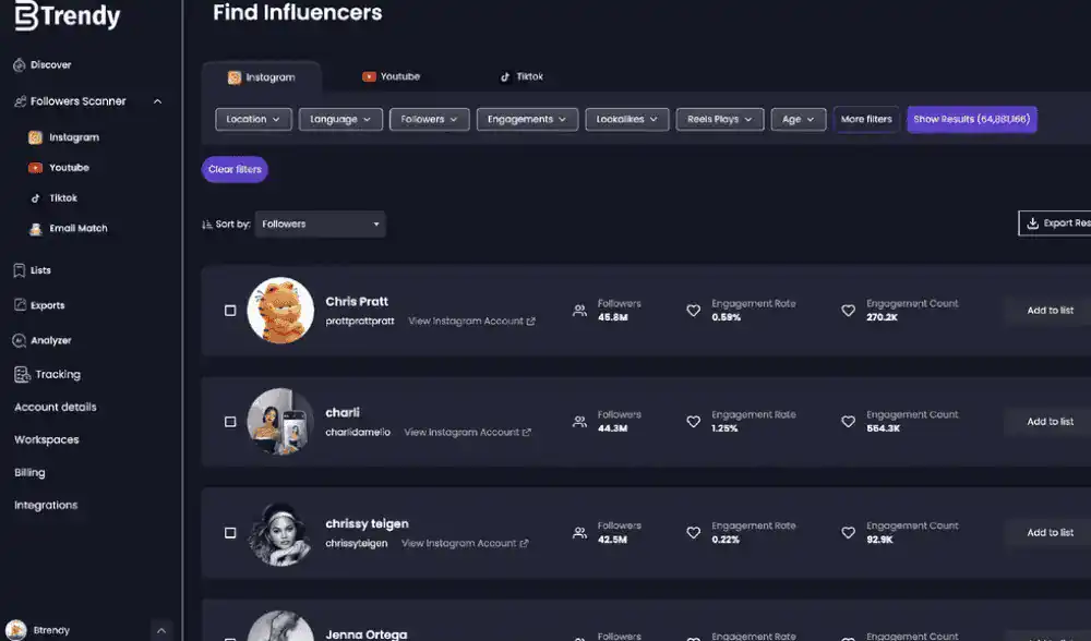 300 million influencers, at your fingertips – It makes it easy to filter through a database of 300 million influencers and find the right YouTube, Instagram, and TikTok creators for your campaigns.