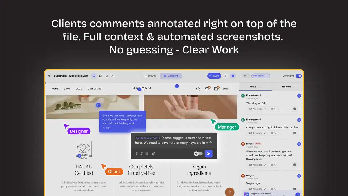 Getting client feedback shouldn’t feel like you’re playing digital charades. BugSmash helps you collect clear, contextual feedback from clients and stakeholders to speed up your creative process and get more done.