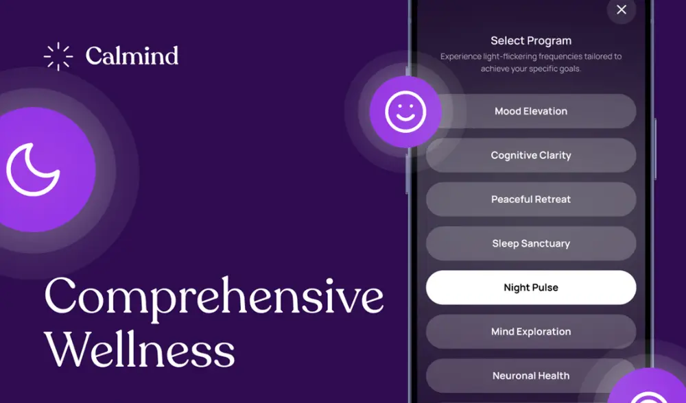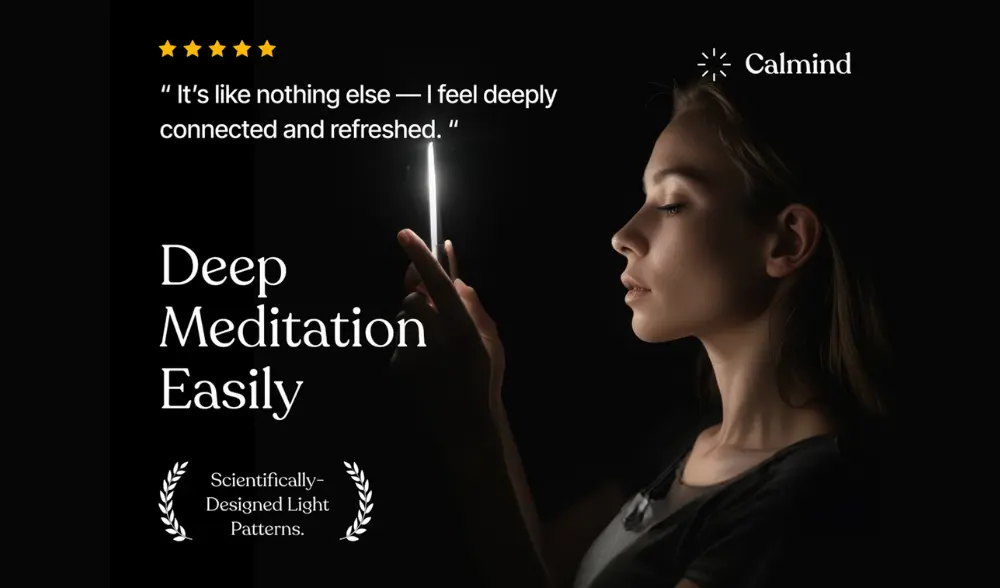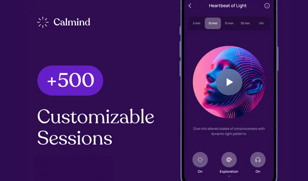 Flickering Light Stimulation (FLS): Calmind’s FLS technology uses precise light patterns to synchronize brainwaves, making meditation easier and offering a drug-free, semi-psychedelic experience that bridges traditional meditation and the effects of psychedelics.