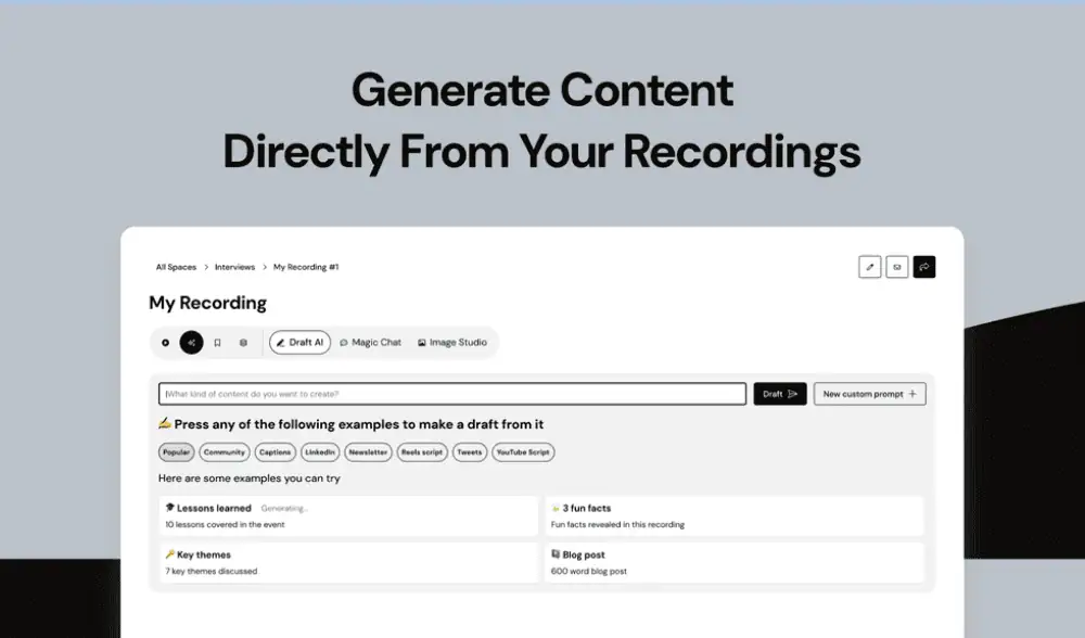 • Use preset AI prompts and time stamps to generate text for content titles, key takeaways, and blog posts