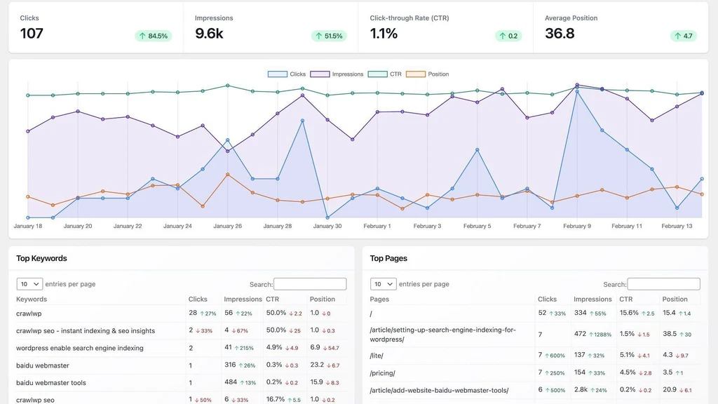 CrawlWP is a WordPress SEO plugin that boosts site visibility on search engines with instant, automatic indexing, and SEO performance insights.