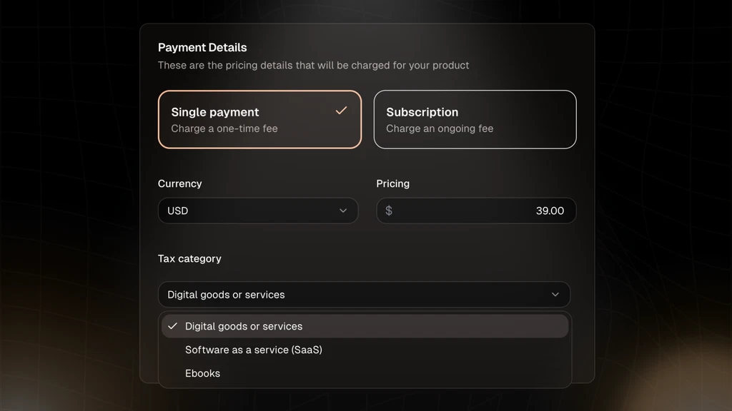 Creem makes it easy to accept payments from anywhere, taking all your tax headaches away—simply create a product, set the price, and choose a tax category.