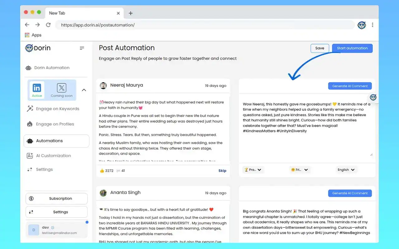 The platform’s social media integration capabilities extend far beyond simple automation, offering intelligent engagement across LinkedIn, Twitter, and Instagram. Dorin reads and analyzes post content, comments, and social context to generate meaningful, relevant responses that drive genuine engagement.