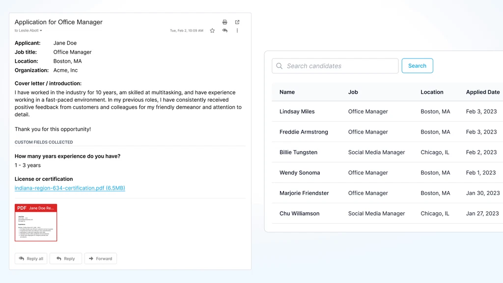 Dropboard automatically converts resumes into PDFs and sends applications to your hiring manager’s inbox. All they need to do is hit “reply” to engage!