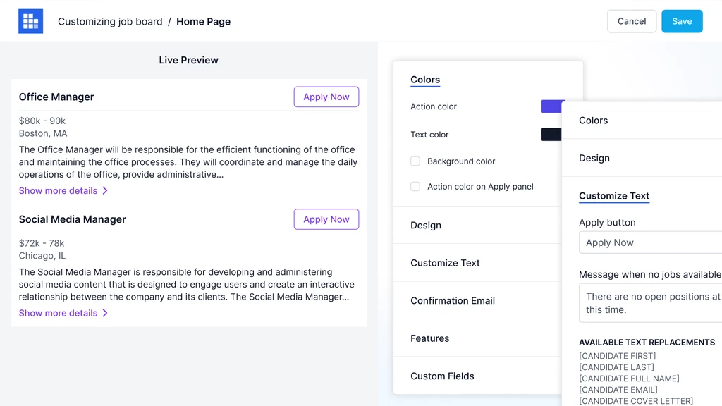 Customize colors, text, screening questions, file uploads, and features like search and location filtering—and preview it all before going live!