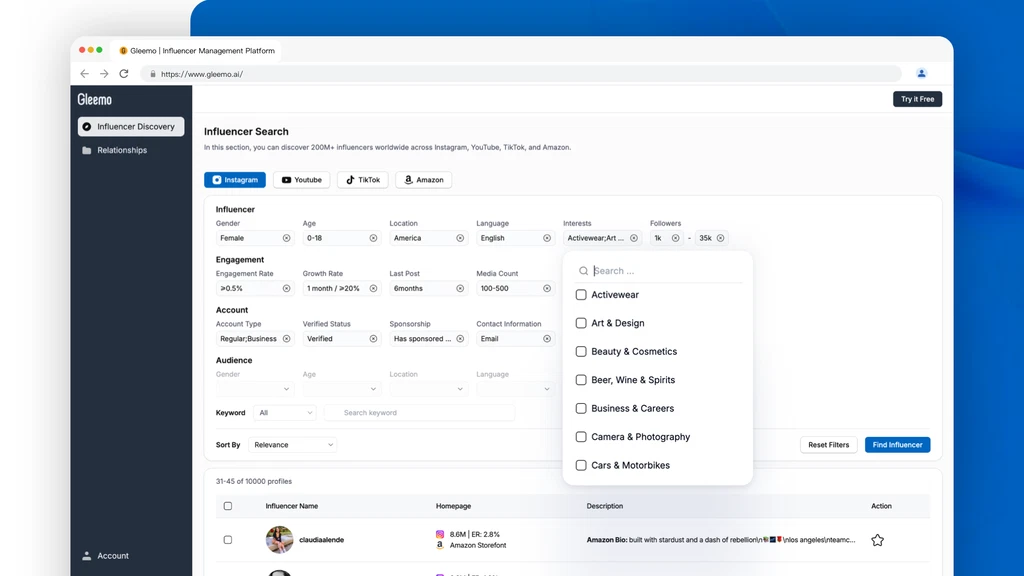 Gleemo helps you discover the best influencers for your campaigns and manage partnerships on the same platform.