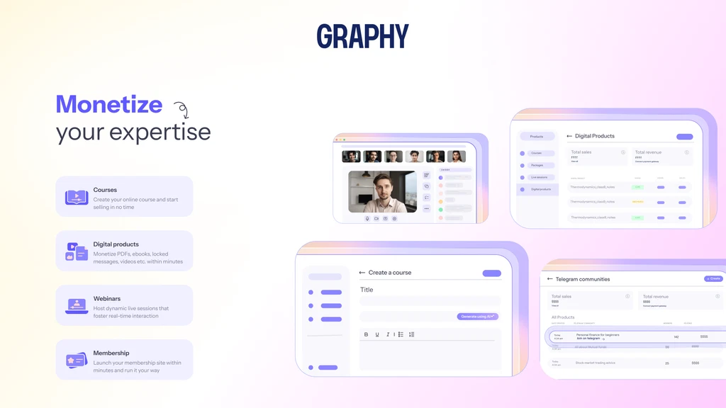 Graphy makes it easy to sell courses, memberships, webinars, and digital products, so you can monetize your expertise.