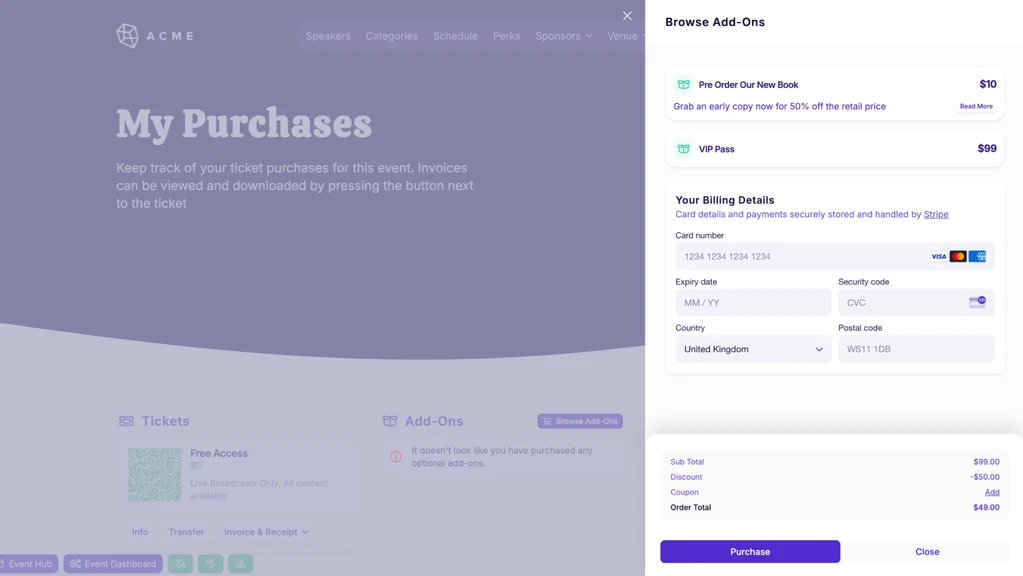 - Set up coupons or discounts and run affiliate offers right from your event