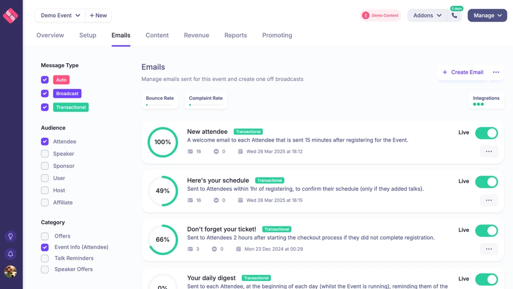 - Save time with pre-made email reminders, speaker onboarding flows, and landing page templates