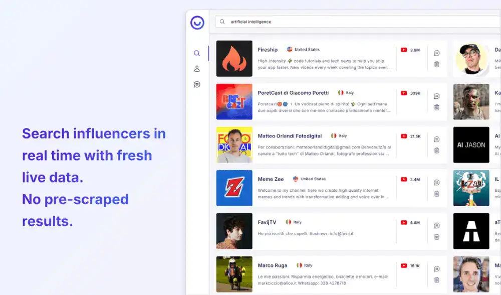 Influeencer does not rely on a limited, pre-built database. Instead, it accesses all YouTube, TikTok, and Instagram profiles directly and in real time.
