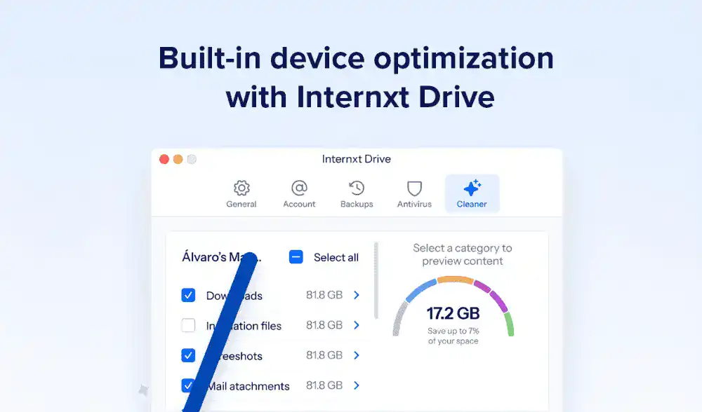 This frees up storage space and reduces the chances of problems that can slow you down. Whether you use a PC or a Mac, Internxt Cleaner boosts your system’s speed and health.