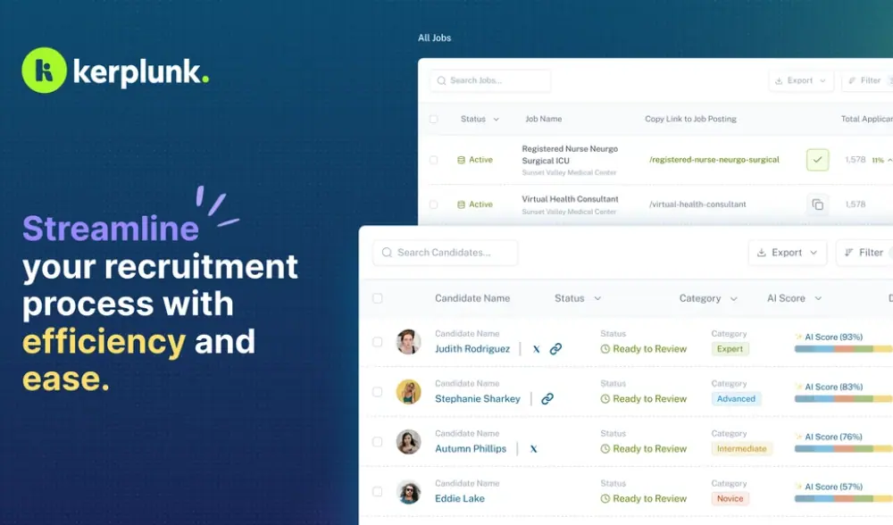 Empower your recruitment team to design a hiring process that works best for you. Kerplunk’s flexible workflow design sets your team up for success with an intuitive interface, easy navigation, and comprehensive tools that streamline the hiring process.