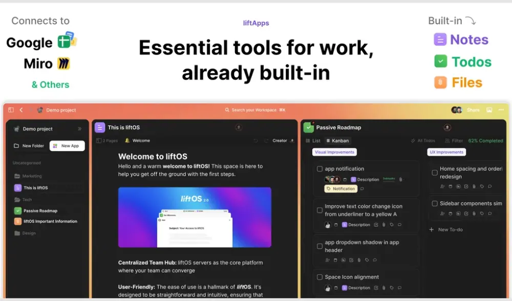 It is a productivity suite that lets you organize projects, tasks, notes, files, and tools in one place.