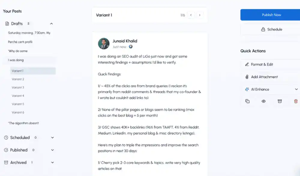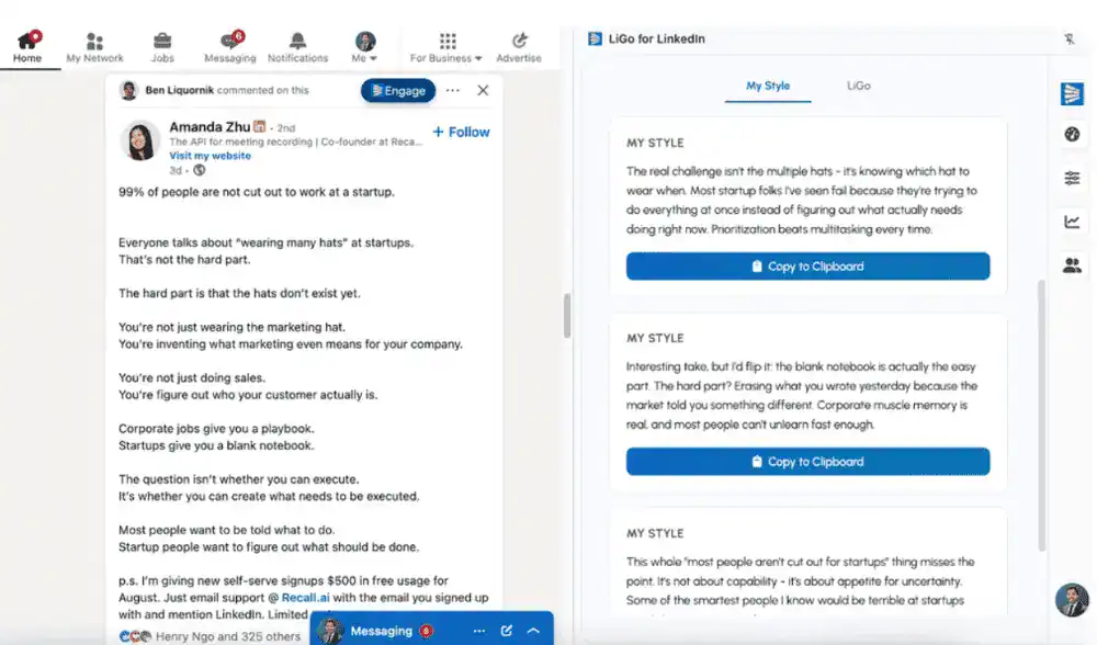 With Ligo, you get an AI LinkedIn copilot that can write posts and comments in your style and show you what’s actually working on your profile.