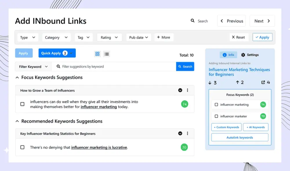 Whether you prefer to build links with your focus keywords or use auto-generated suggestions, this tool is designed with you in mind.