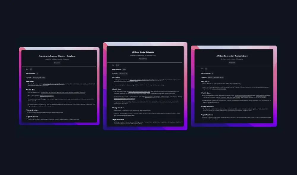 Pain points, Description, Target Audience, Keyword, Search Volume, and Pricing Structure.