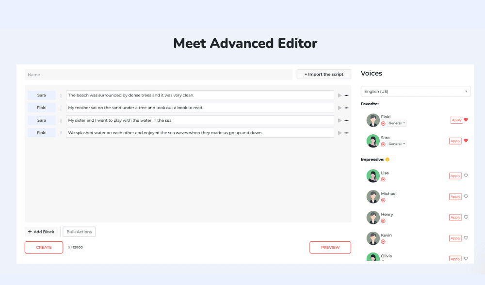 Features such as multi-voice and rate/pitch fine-tuning allow you to find just what you’re looking for in your script.