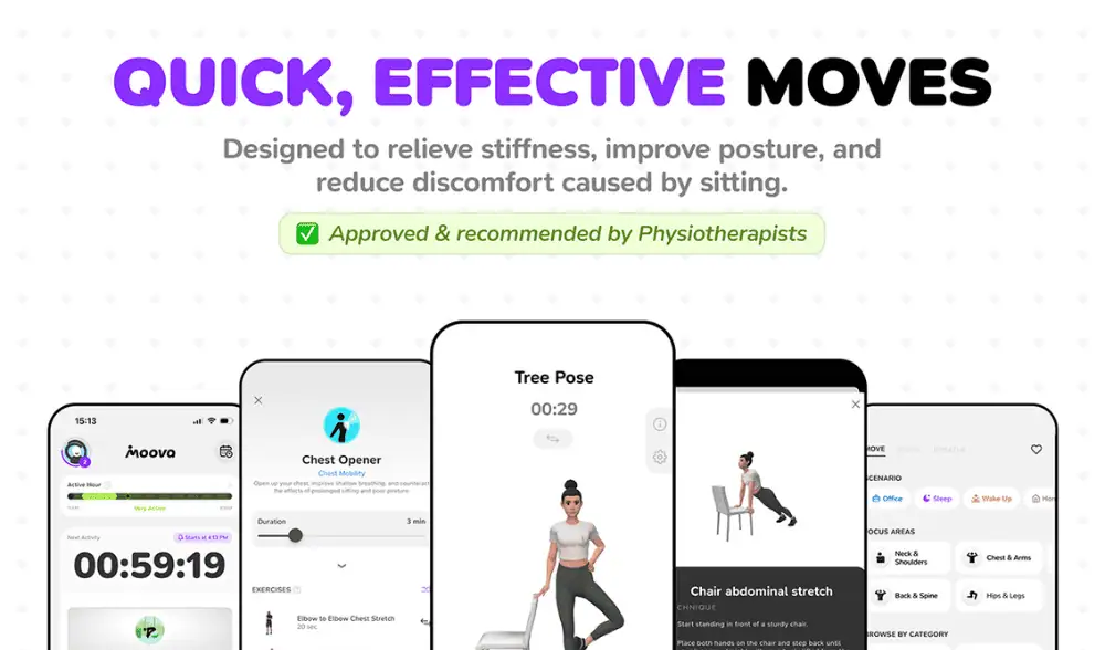 With 200+ expert-designed exercises, flexible scheduling, and holistic tracking, Moova empowers you to stay active, improve focus, and boost your well-being anytime & anywhere.