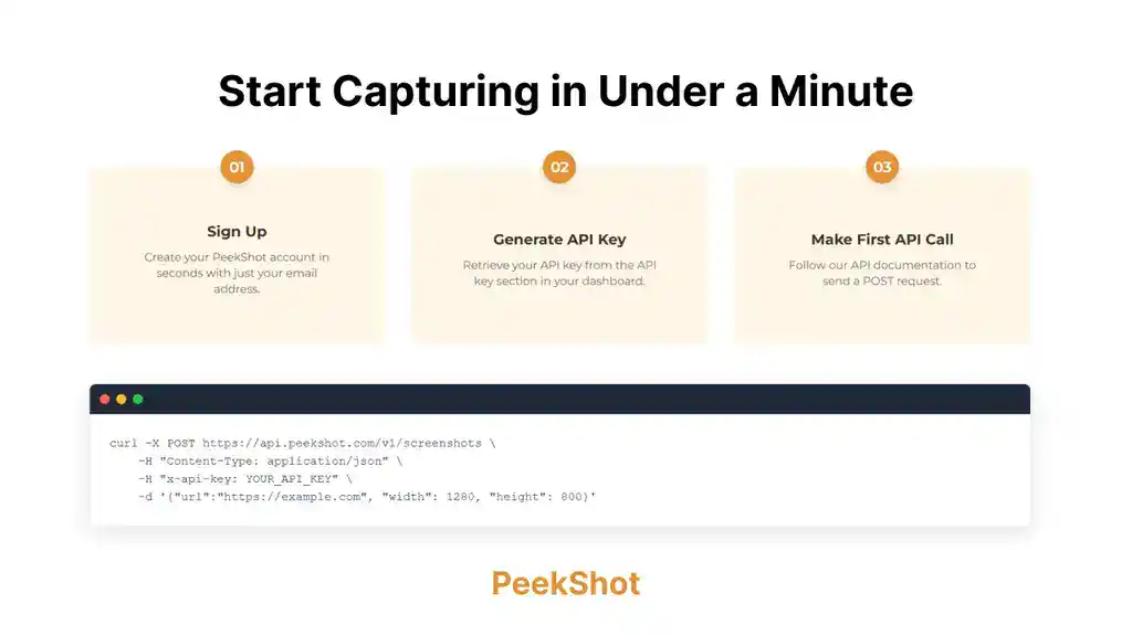 Stop wasting time with clunky tools and manual workflows. PeekShot gives you a fast, customizable, and reliable way to generate high-quality screenshots—backed by automation, scalability, and clean code.