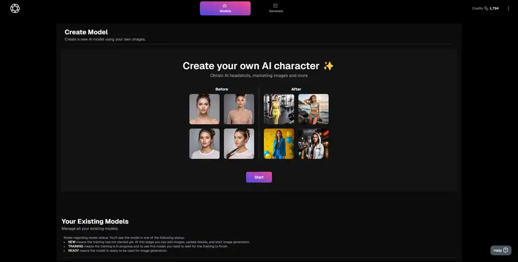 • Train an AI photo model of yourself by simply uploading a few casual selfies