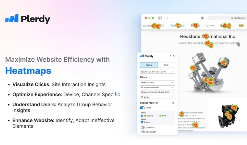 Plerdy’s heatmaps let you analyze site behavior with tons of different reports.