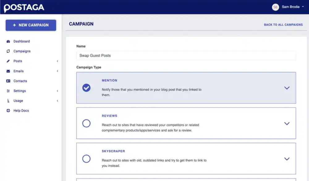 Choose the campaign type you need based on your content or specific keywords, and start sending outreach in just a few minutes.