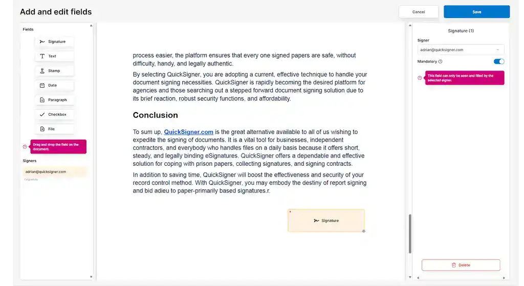 - Add custom fields like signatures, stamps, checkboxes, text, and even file attachments