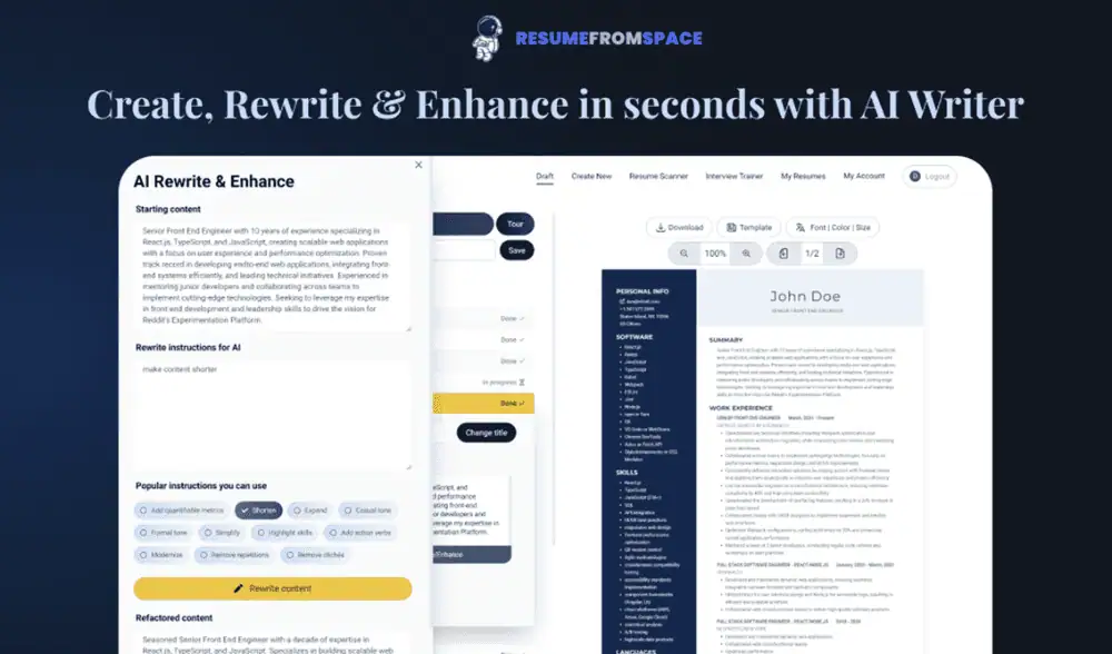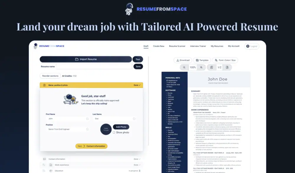 Struggling to stand out? ResumeFromSpace uses AI to craft a polished, professional resume that gets noticed. Whether you’re a recent graduate or a seasoned professional, this smart resume builder optimizes your content, formats it perfectly, and helps you highlight your strengths.