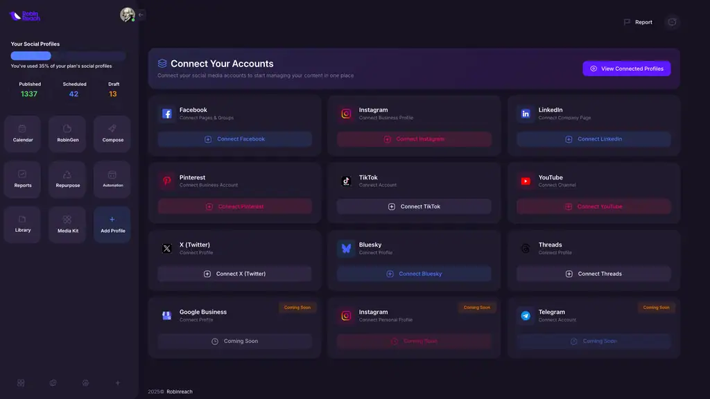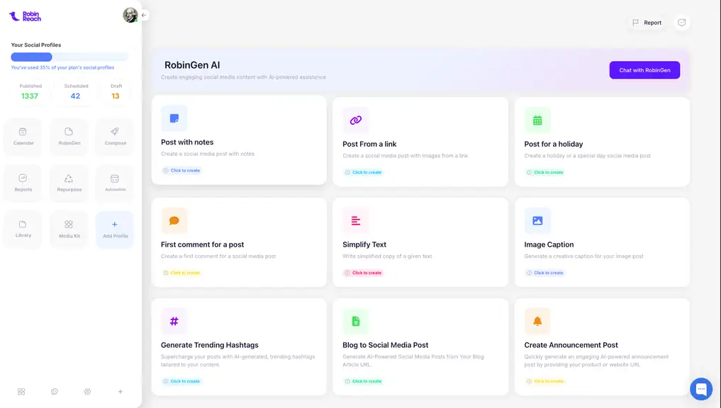 RobinReach is an all-in-one AI platform that lets you create, schedule, and repurpose social media content across multiple platforms.