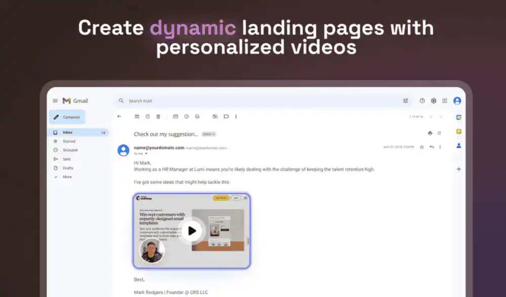 Record a single video pitch and let AI generate hundreds of custom versions—each one addressing your contact by name, mentioning their company, or speaking to their unique needs. You get high-touch feeling at scale.