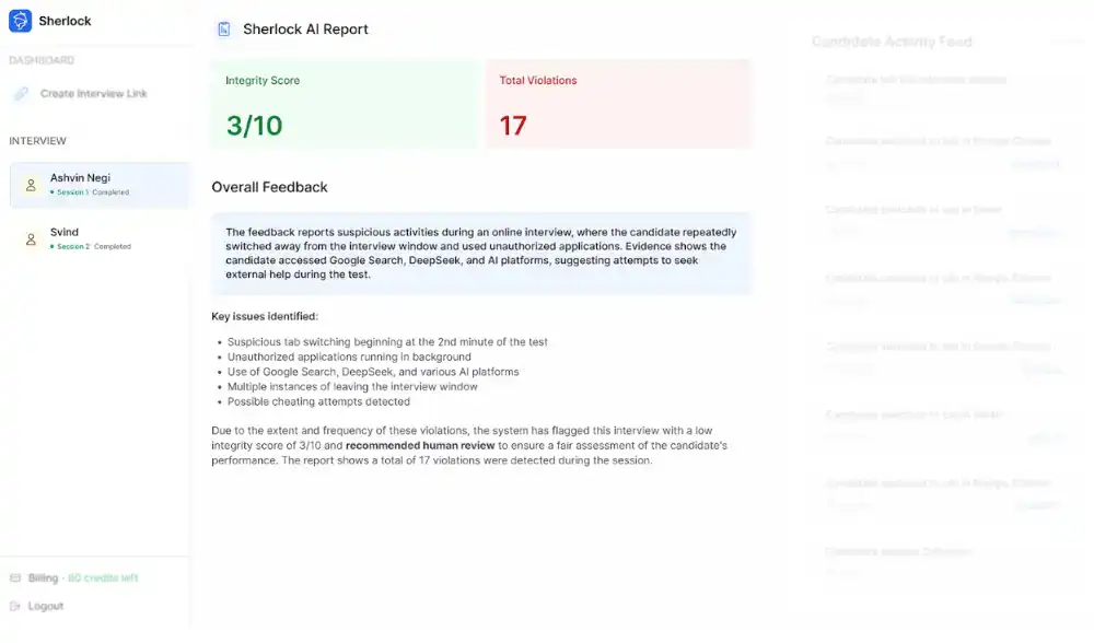 Don’t worry about hiring the wrong fit. With Sherlock AI, you can flag suspicious behavior and identify AI-generated presence.