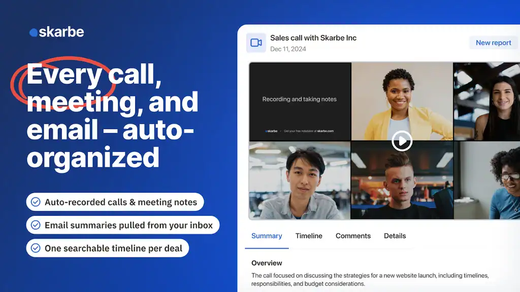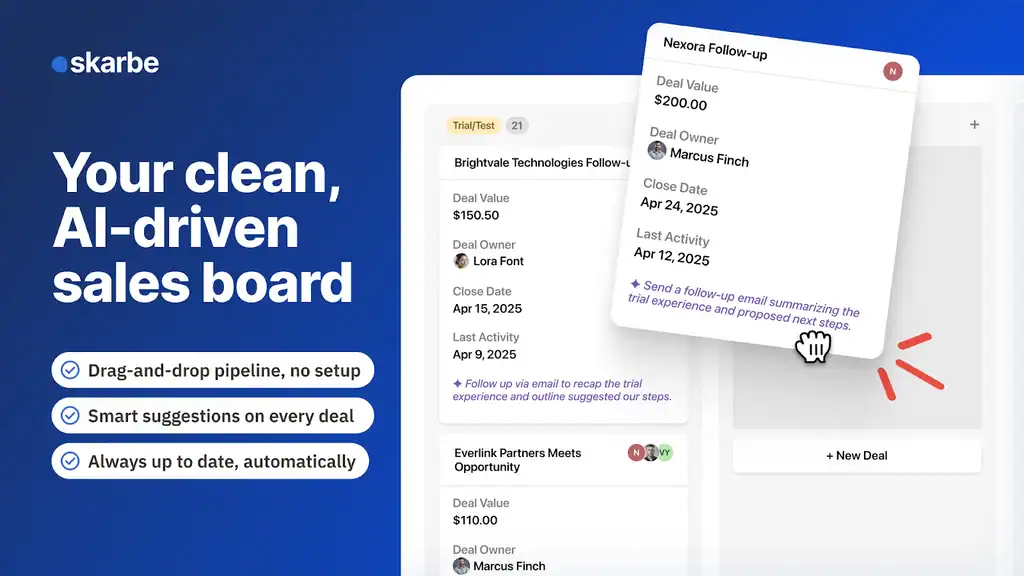 Skarbe is an AI-powered sales assistant that automatically captures sales activity and suggests next steps, so you can replace your clunky CRM.
