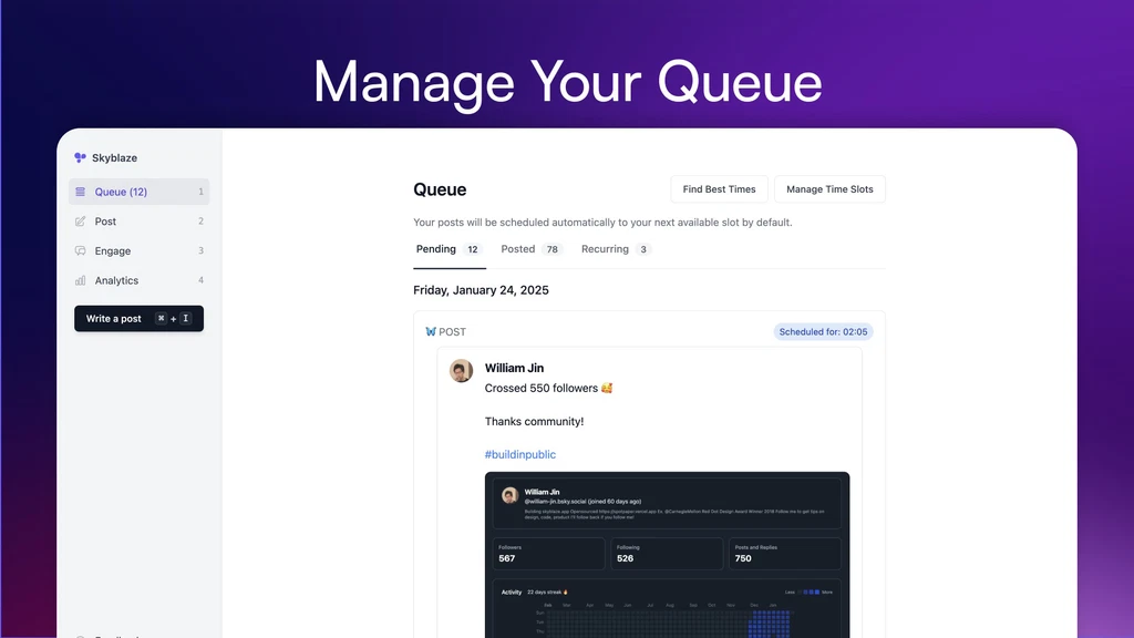 Skyblaze helps you create viral content, automate scheduling, and engage your audience with ease.