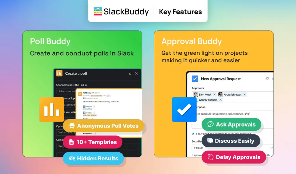 Slack Buddy consists of 2 apps. Poll Buddy simplifies the creation of polls to gather team input and Approval Buddy helps manage approval requests for a more efficient workflow.