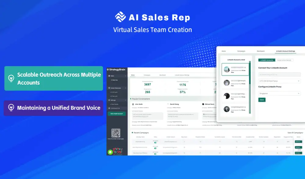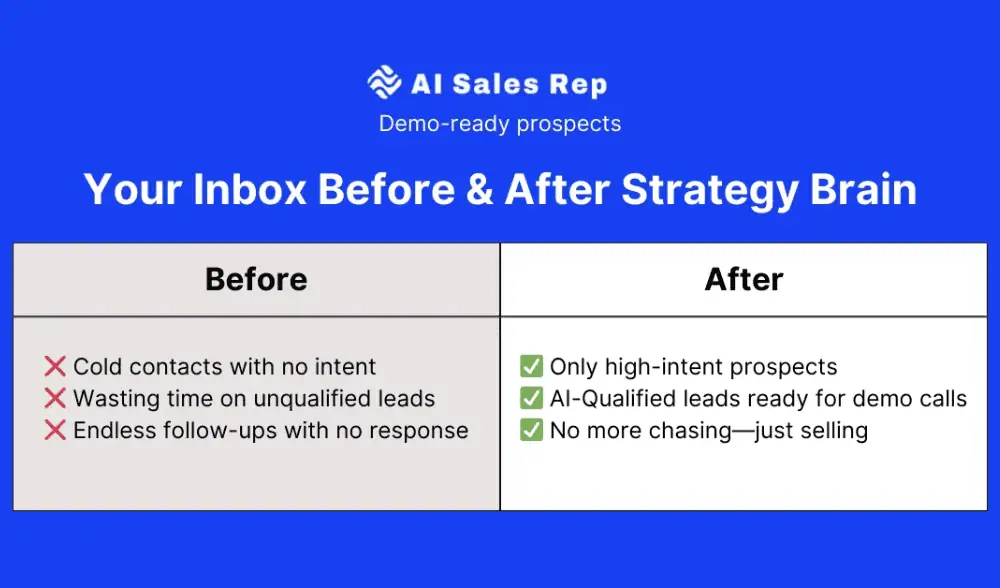 - You’re a sales manager leading a small team and need to scale without hiring more reps. StrategyBrain’s AI acts as an automated Sales Rep, handling lead generation, follow-ups, and qualification 24/7, ensuring your team only talks to high-intent prospects.
