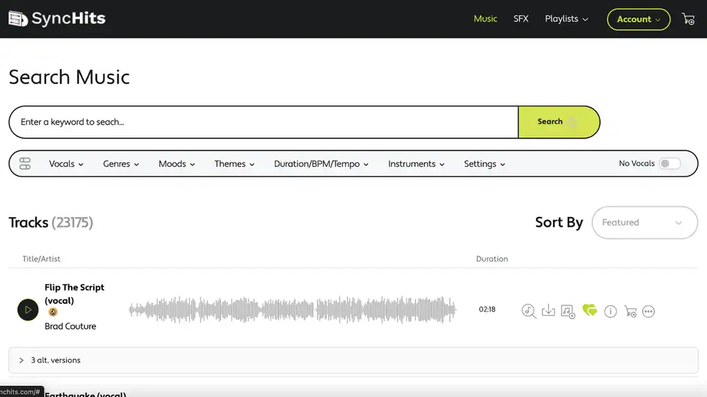 Whether you need a chill background loop or a high-energy opener, SyncHits makes it easy to discover the right songs for your projects.