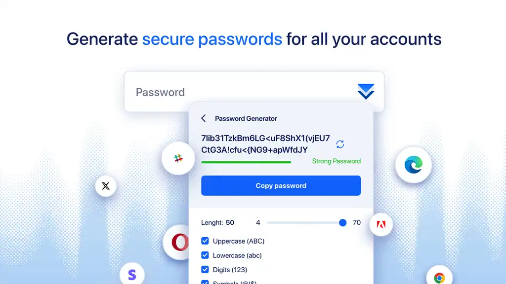 Use the built-in password generator to create long, complex, and unique passwords for every account—then store them safely so you never have to remember them again.