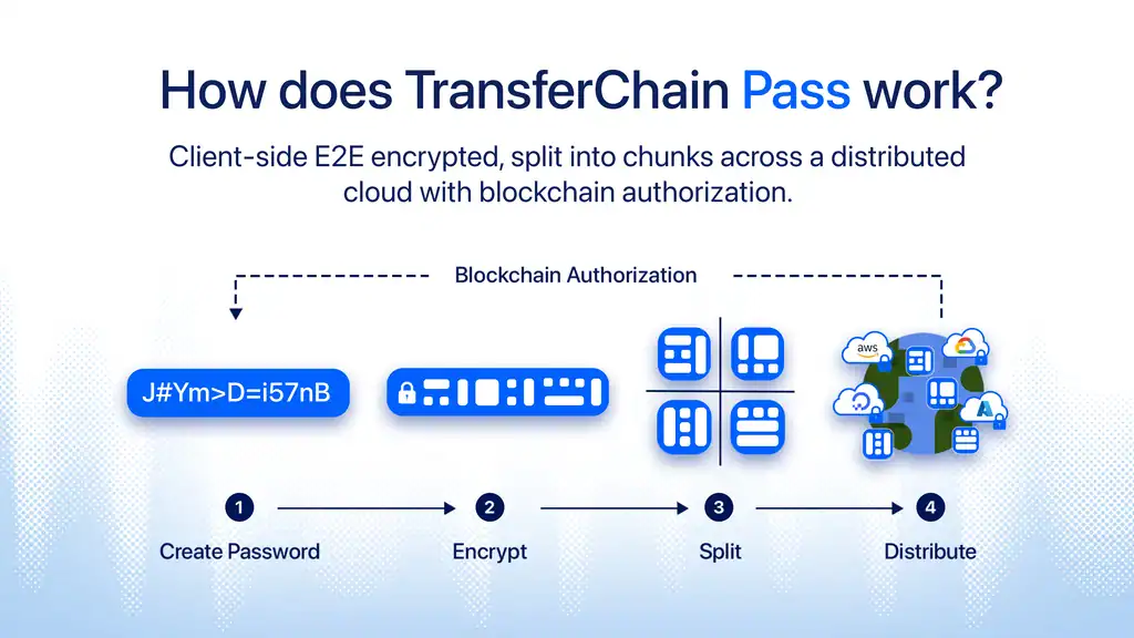 TransferChain Pass encrypts your passwords on your device, splits them into chunks, and distributes them across secure cloud storage with blockchain-based access controls.