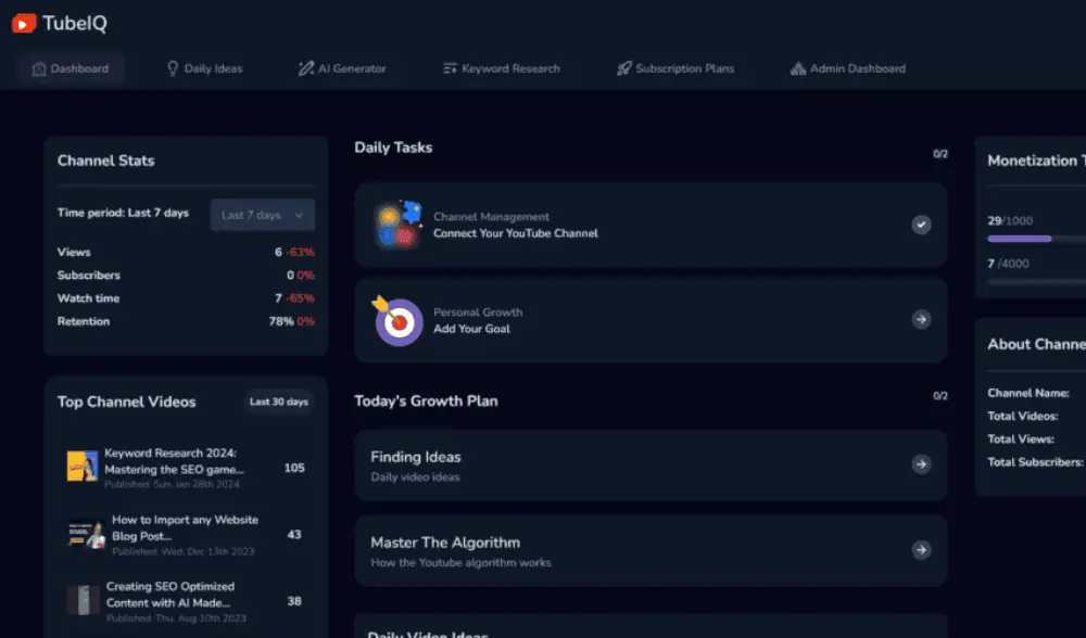 With features like advanced analytics, AI-powered video ideas, and SEO optimization, TubeIQ has everything you need to succeed in the competitive world of YouTube.