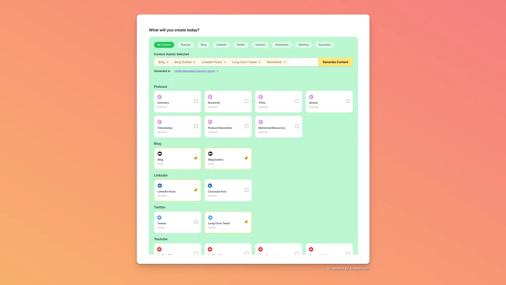 With Unifire.ai, you’ll be able to turn any piece of existing content into over 30 assets for YouTube, LinkedIn, Twitter, and beyond.