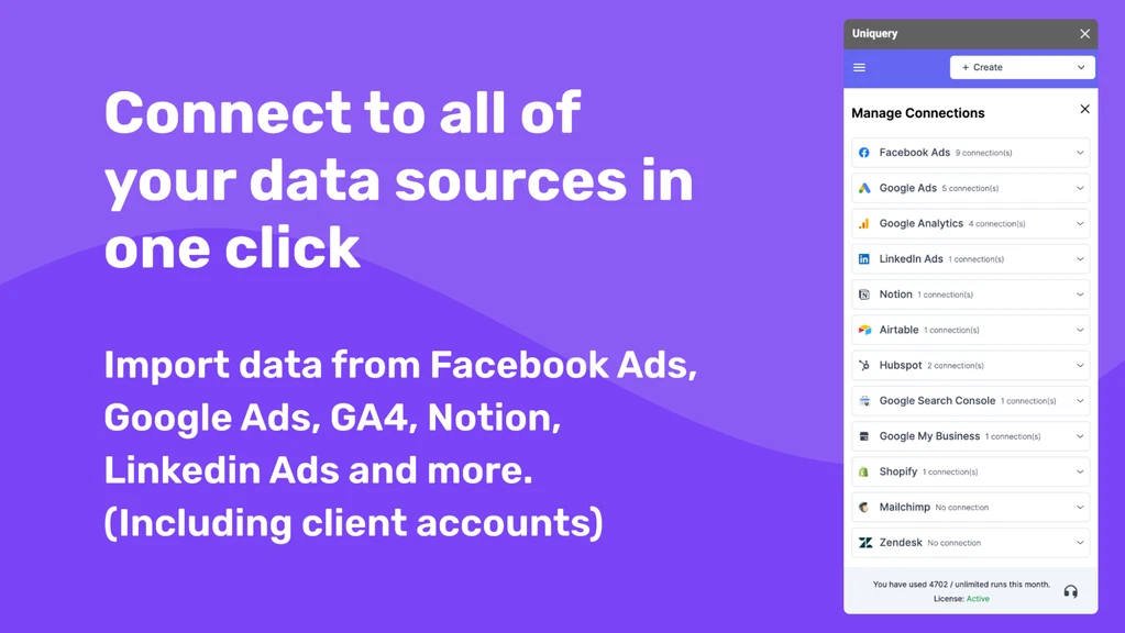 Uniquery helps marketing agencies and brands import marketing data into Google Sheets to generate insights and reports for clients.