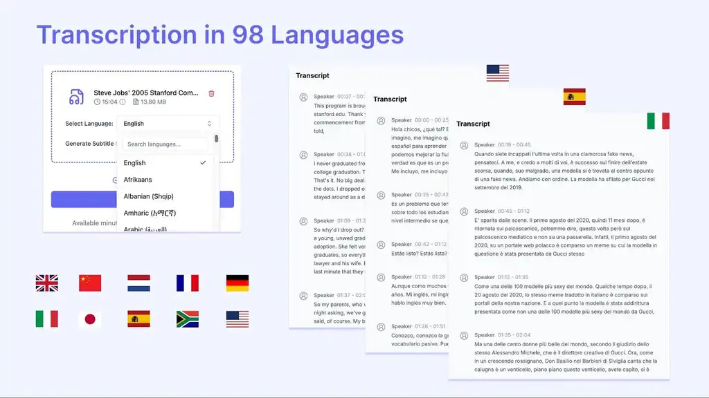 • Supports transcriptions in 98 languages